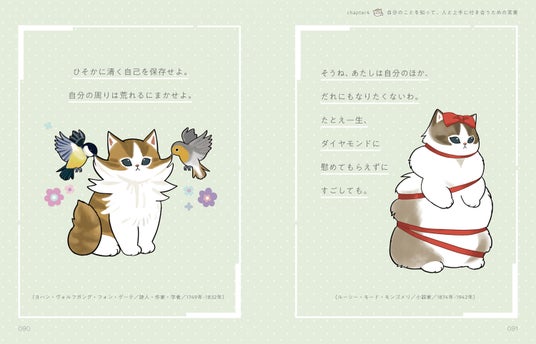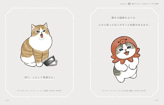 名言の内容に合わせて「サメにゃん」「ハチにゃん」「うさにゃん」を始めとした、「mofsuand」のかわいいにゃんこのイラストもたっぷり掲載。