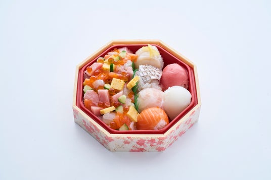 かわいらしくて食べやすい手毬とお魚たっぷりの海鮮バラチラシを1折に。