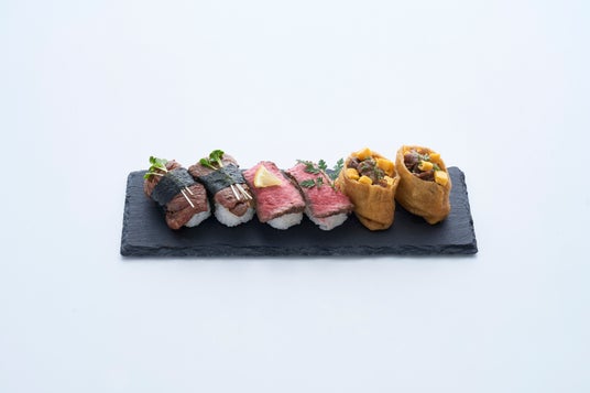 特製焼肉だれで肉寿司を、割り下で柔らかく煮込んだお肉いなり、人気のローストビーフをお寿司に。3種類を楽しめる日山の豪華肉寿司。