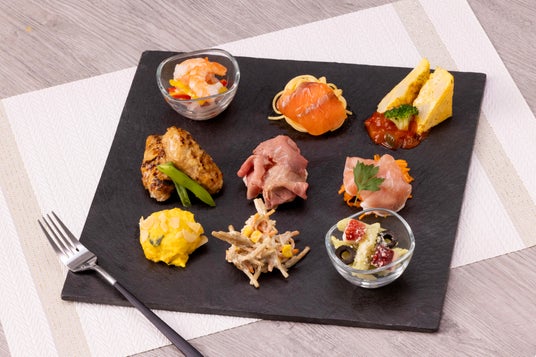 ローストビーフ、スモークサーモントラウト、生ハム、えびなど、9種類のごちそうを盛り込んだ、彩り豊かな豪華盛り合わせ。