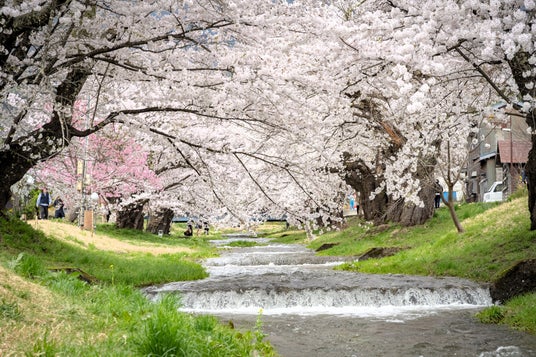 リステルより徒歩10分。雪解け水が流れる小川沿いに、約1kmの桜並木が続く福島を代表する景勝地。お花見弁当でピクニックも楽しめます。