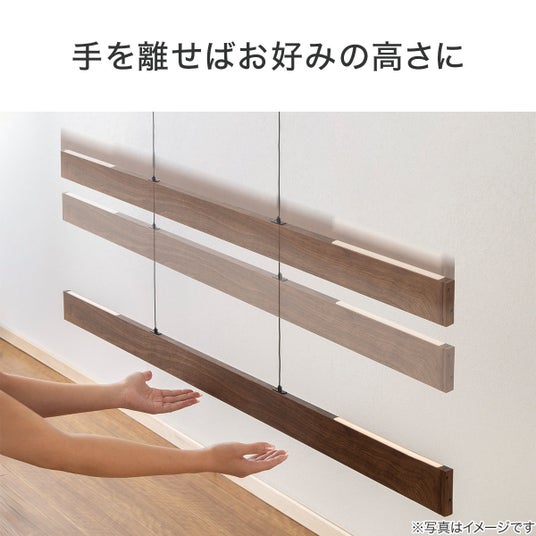 バーライトを手で引くことで2本のコードが引き出され、お好みの高さにバーライトを固定することができます。元に戻したい場合も手で持ち上げるだけでコードが引き戻され、お好みの高さに調整できます。普段は高めの位置でペンダントバーライトとして、高さを下げればデスクライトとして使用でき、リビングやダイニングがワーキングスペースに変わります。