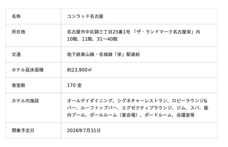 名古屋初、ヒルトンのラグジュアリーブランド「コンラッド・ホテルズ&リゾーツ」が名古屋市・栄駅に直結する新シンボルタワー「ザ・ランドマーク名古屋栄」内に2026年7月31日(金)開業予定