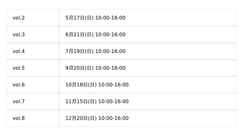 くすくすマルシェは毎月第3日曜日に定期開催します(8月を除く、全8回)。vol.2以降の出店者も随時募集中。ジャンル不問・審査なし・先着順の受付で、すべての方に平等な出店チャンスがあります。
