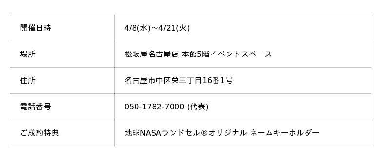 愛知・松坂屋名古屋店にて「地球NASAランドセル(R)受注会」開催いたします