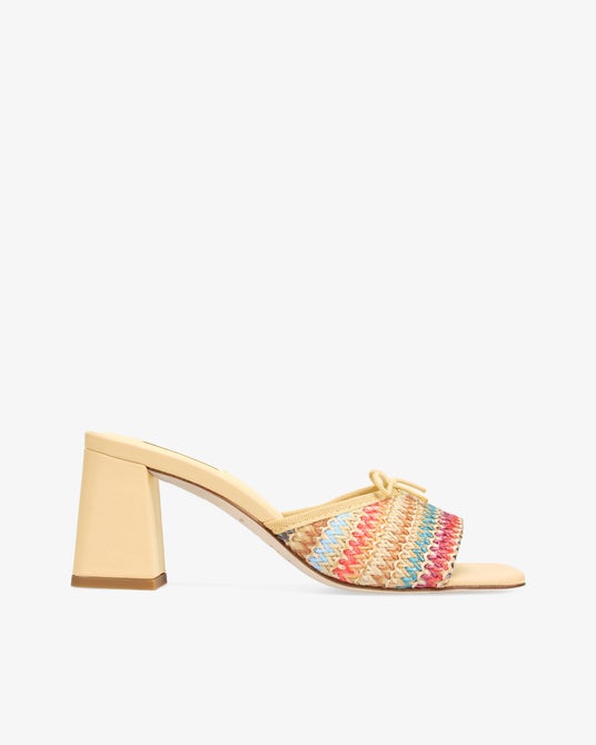 第4弾となる本コレクションは、陽光を想わせる柔らかなイエローを基調に、マルチカラーを纏ったミュールが登場。ラフィアならではの、しなやかで温かみのある風合いが、春夏の装いにナチュラルな品格を添え、軽やかな足取りへと誘います。
