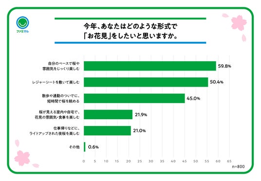 希望するお花見の形式について聞いたところ、「自分のペースで桜や雰囲気をじっくり楽しむ」(59.8%)と回答した人が多く、「散歩や通勤のついでに、短時間で桜を眺める」(45.0%)など自分のペースで楽しみながら、散歩・通勤ついでのお花見を求める傾向が分かりました。一方で、「レジャーシートを敷いて楽しむ」(50.4%)といったピクニックのようなお花見も引き続き人気となっていることが分かります。