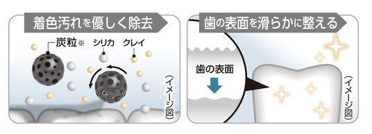 『スミガキ』の代名詞である炭に加え 、粒子の細かい「クレイ*²」を新たに配合しました。大きさの異なる清掃成分を組み合わせることで、歯の表面にある目に見えない細かな凹凸にまで入り込み、蓄積した着色汚れを効率よく除去します。こだわりの配合バランスにより歯の表面をなめらかに整えます。また、炭粒*¹ならではの“しゃりしゃり”とした心地よい清掃実感とともに、磨き終わりの“つるつる感”を叶えるこだわりの使用感も追求しました。