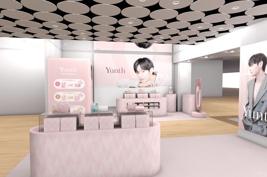 Yunthのテーマカラーであるピンクを基調とした特別な空間に、ブランドアンバサダーであるBTS・Vさんのビジュアルを掲出。ブランドの世界観を体感いただけます。 会場では、Yunthの人気商品と新商品、さらにオリジナルノベルティを組み合わせたポップアップ限定セットの販売や、予約来場者限定の特典など、この期間だけの特別なコンテンツをご用意。
