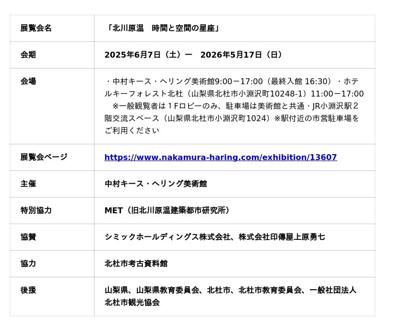 中村キース・ヘリング美術館(山梨県・小淵沢)では、当館の設計を手がけた建築家・北川原温氏による展覧会「北川原温 時間と空間の星座」展の閉幕(2026年5月17日)に先立ち、同氏の建築を深掘りする特別イベントを開催します。