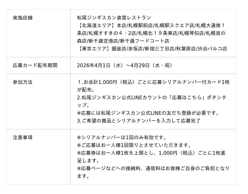 【直営レストラン限定企画】松尾ジンギスカン × 北海道日本ハムファイターズ 観戦チケットなどが当たるプレゼントキャンペーン【応募カード配布期間:2026年4月1日~4月29日】