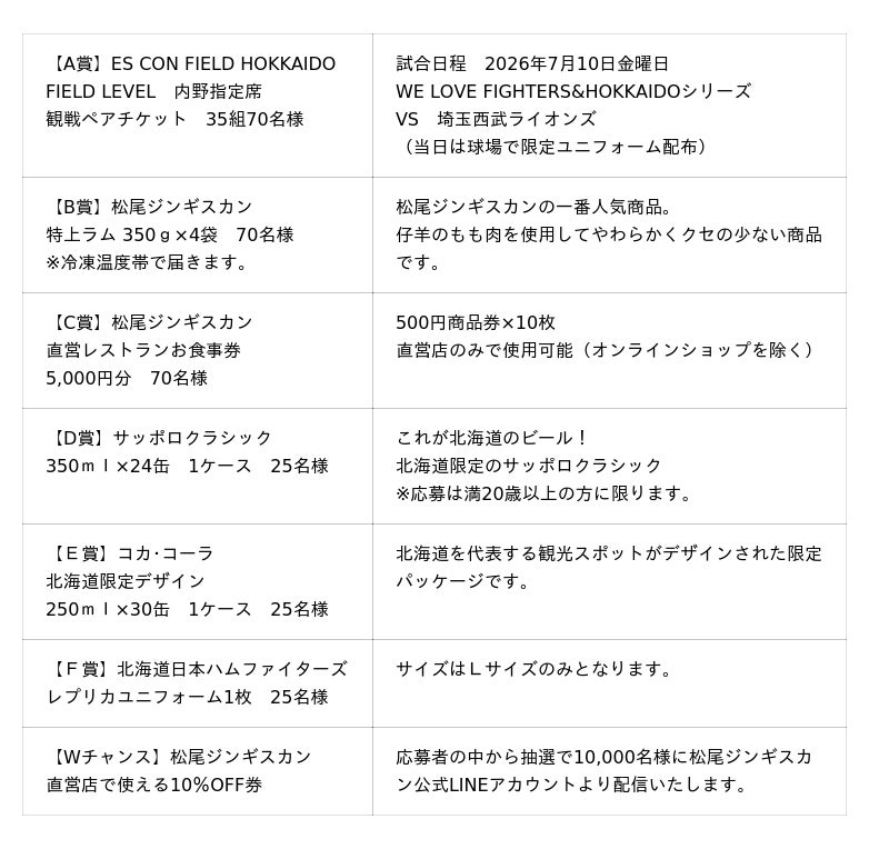 本キャンペーンは、対象の松尾ジンギスカン直営店舗をご利用いただいたお客様を対象に、抽選で北海道日本ハムファイターズの観戦チケットや松尾ジンギスカンなどが当たる特別企画です。北海道の食文化であるジンギスカンと、北海道を本拠地とするプロ野球チームを応援することで、地域を盛り上げることを目的としています。