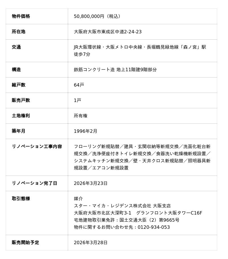 リノベーションマンションの供給を行うスター・マイカグループの中核事業会社であるスター・マイカ株式会社(本社:東京都港区、代表取締役:水永 政志)は、大阪府大阪市東成区のマンション「サンヴェール森ノ宮」の1室をリノベーションいたしました。本物件は、パナソニックの暮らし方提案「Life Style Fit」とのコラボレーション物件として、2026年3月25日よりモデルルームとして公開し、同年3月28日より販売開始を予定しております。