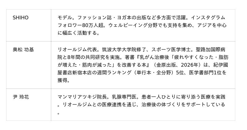 リオール株式会社が運営する医療連携型パーソナルジム「リオールジム」(東京都中央区、代表:奥松功基)は、2026年4月26日(日)に「出版記念スペシャルトークショー with SHIHO」を日本出版クラブ(東京都千代田区)にて無料開催する。