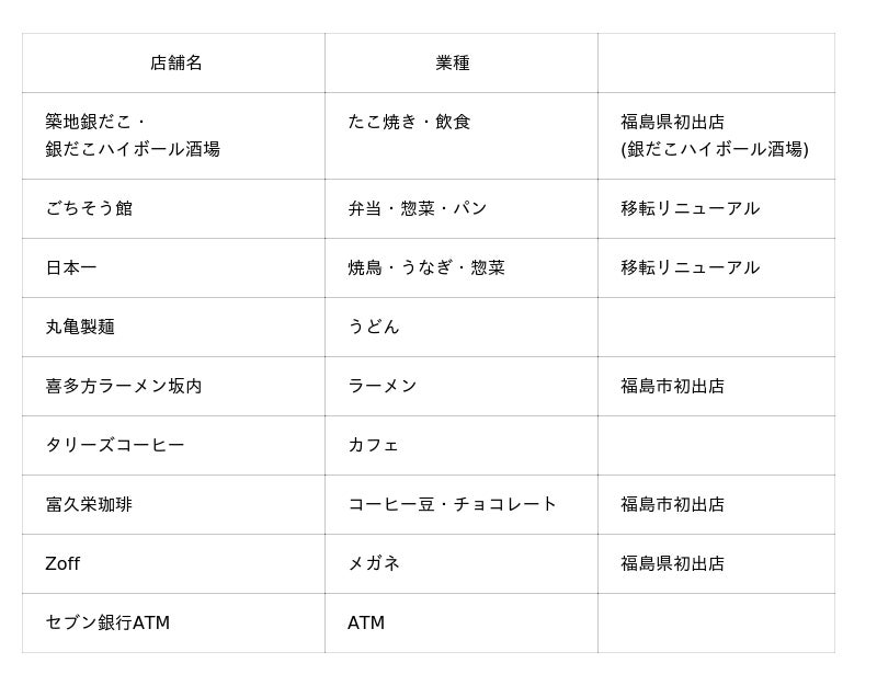 このたび、2026年3月28日(土)の第1期リニューアルオープンに続き、福島県初出店のスーパーマーケット「食生活(ハート)(ハート)(ラブラブ)ロピア」(以下、ロピア)が2026年4月15日(水)にオープンいたします。また、職業訓練教室・CBTテストセンターの「カルチャーコミュニケーション」が2026年4月24日(金)に開講し、新たな地域の場も創出します。さらに、初夏には不二家のカフェ・スイーツ新業態「ペコちゃんmilkyタイム」が東北に初出店いたします。
