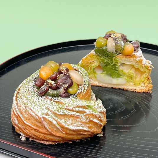 バターが贅沢に香るサクサクのデニッシュ生地で餅と抹茶カスタードクリームを包み、かのこ豆と金粉をトッピング。