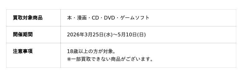 本・漫画・CD・DVD・ゲームソフトなどをその場で現金化、3月25日~5月10日までの期間限定