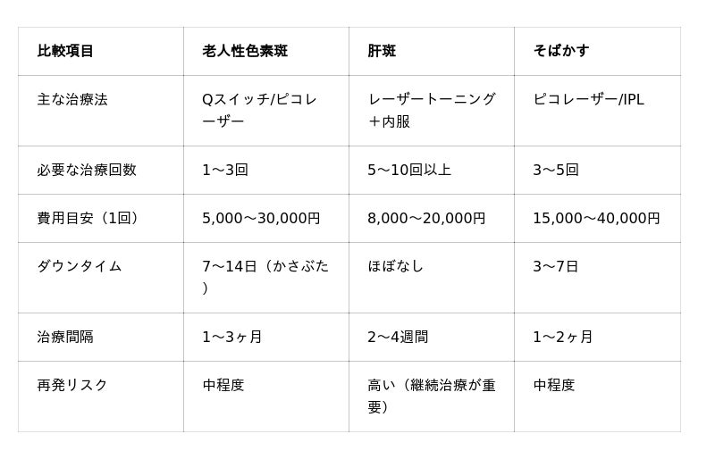 シミの種類別 治療法・回数・費用の比較