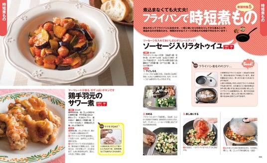巻頭特集5は「フライパンで時短煮もの」。大きめのフライパンにふたをすることで、時間がかかるイメージの煮ものも時短で作れます。鶏手羽元のサワー煮、チキンのコーンクリーム煮、中華五目うま煮などを紹介。