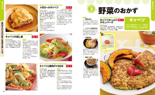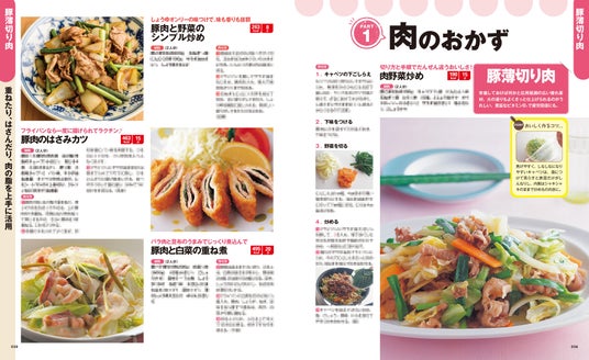豚薄切り肉、豚厚切り肉、鶏もも肉、鶏むね肉など肉のおかずから、ぶり、さけなどの魚介のおかず、キャベツ、白菜などの野菜のおかず、卵・豆腐のおかずなど、レシピを材料別に紹介。メインになるおかずを中心に紹介しています。材料別料理さくいんもついているので、家にある材料で作れる料理がすぐ探せます。