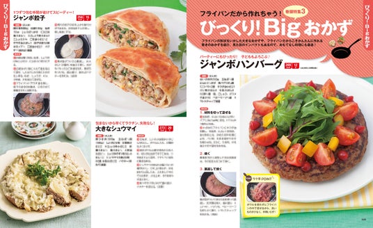 巻頭特集3では、フライパンの大きさを生かしたジャンボハンバーグなど、「びっくり!Bigおかず」を紹介。