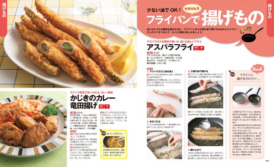 フライパンなら、揚げものや煮ものも簡単に、短時間でできます。巻頭特集4は「少ない油でOK!フライパンで揚げもの」。アスパラフライや、かじきのカレー竜田揚げのほか、人気のチキン南蛮やユーリンチーのレシピも紹介。