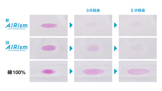 〈消臭検証〉1.最新エアリズムクルーネックT、2.旧エアリズムクルーネックT、3.一般的な綿100%インナーにフェノールフタレインで着色したアンモニア溶液を2~3滴垂らし、消臭効果を比較する実験をしたところ、最新エアリズムが一番早くアンモニアを中和し、無色になりました。 (*1) 24SS エアリズムVネックT/クルーネックTと比較