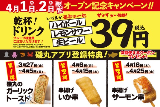 4月1日・2日限定でオープン記念キャンペーン開催!生ビール・ハイボール・レモンサワーを税込39円でご提供※1 開店日から4月25日迄のご来店で次回使えるアプリ会員限定新商品プレゼントクーポンを進呈