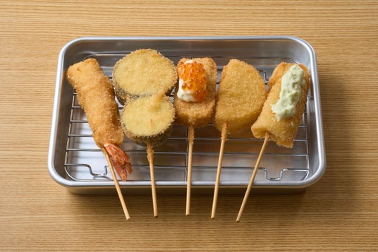 サーモン串: 269円(税込296円) 串揚げ5本盛合せ:799円(税込879円)