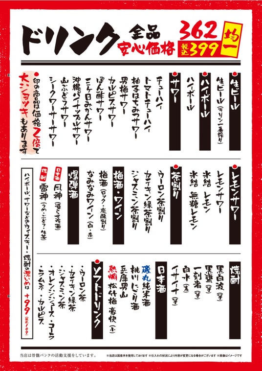🍻ドリンク税込399円均一価格(価格2倍で大ジョッキもあります!)
