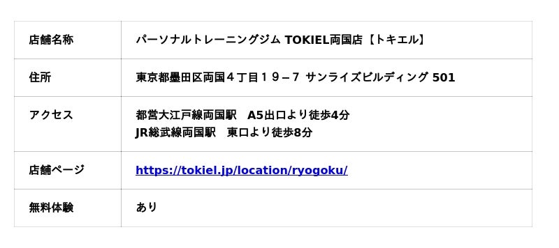 JR総武線 両国駅『パーソナルトレーニングジム TOKIEL両国店【トキエル】』オープン【東京都墨田区両国4丁目19−7 サンライズビルディング 501】