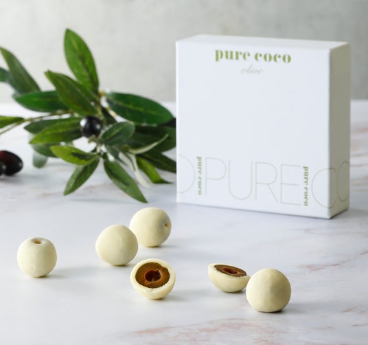グラッセしたオリーブをホワイトチョコレートでコーティングした、大人味の一品です。