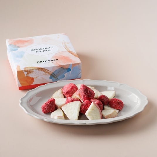 「いちご」「りんご」の2種のフリーズドライフルーツにホワイトチョコレートを染み込ませ、1箱に詰めた商品です。