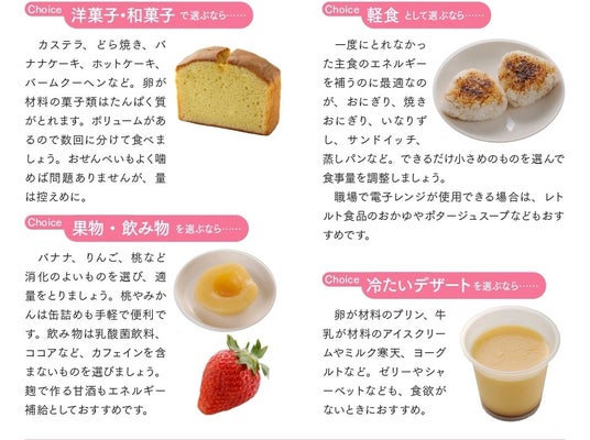 エネルギーを補いたいとき、一度にたくさん食べられないときは、3回の食事以外に間食をとります。市販品も活用するのもよい手です。甘いもの以外に、小さなおにぎりやパン、スープでもOK。