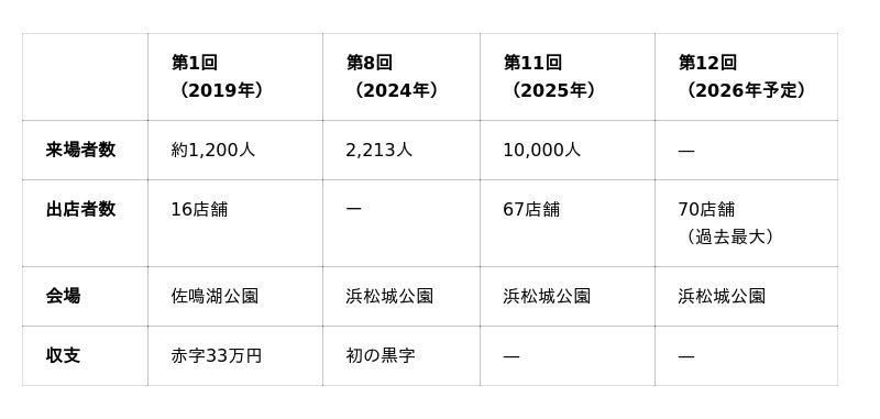 転機は2024年。第8回から会場を浜松城公園に移したところ、来場者2,213人(入場ゲートカウンター計測)で初の黒字を達成した。2025年5月の第10回は5,956人、同年11月の第11回で来場者10,000人に到達。出店者数も第1回の16店舗から67店舗へと拡大した。