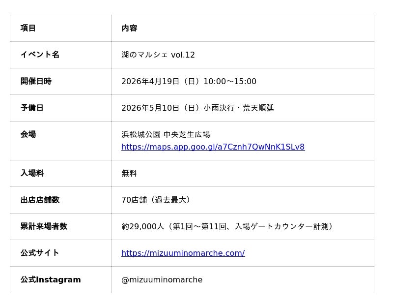 静岡県浜松市の住宅会社・株式会社LIFEFUND(所在地:浜松市中央区、代表取締役:白都卓磨)は、2026年4月19日(日)に浜松城公園 中央芝生広場にて「湖のマルシェ vol.12」を開催する。2019年の初開催以来、累計1,000万円以上を自社負担しながら7年間継続し、入場ゲートカウンター計測で累計来場者約29,000人を記録。今回は過去最大の70店舗が出店する。入場無料、10:00~15:00。