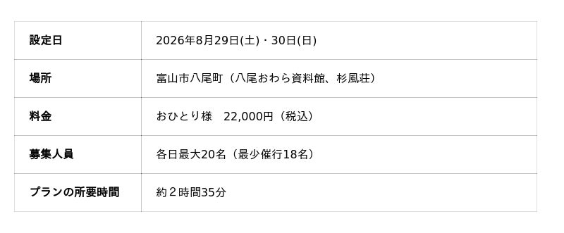 本プランは、例年約20万人が訪れる本祭の喧騒とは対照的に、静寂の中で“本質のおわら”に触れることができる、わずか20名限定のプレミアム体験です。