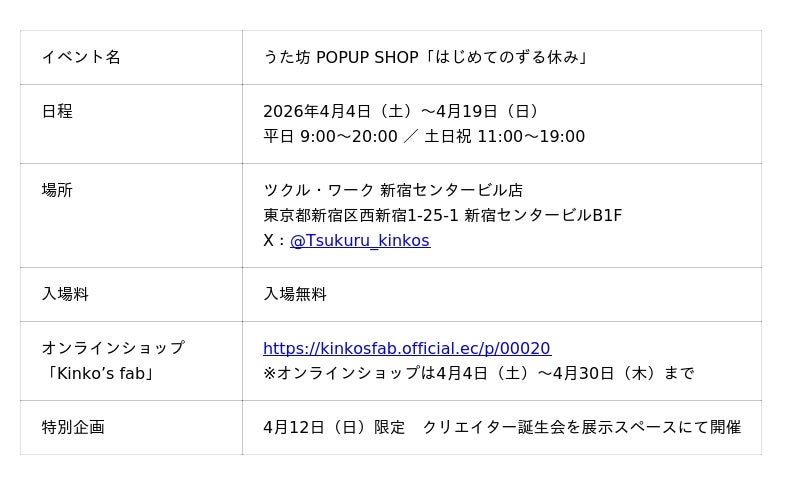 キンコーズ・ジャパン株式会社(本社:東京都港区、代表取締役社長:渡辺浩基、以下 キンコーズ)は、イラストレーター うた坊 によるPOPUP SHOP「はじめてのずる休み」を、2026年4月4日(土)~4月19日(日)まで、ツクル・ワーク新宿センタービル店(以下 ツクル)にて開催します。本イベントでは、創作をテーマにした作品展示やオリジナルグッズの販売に加え、好きなイラストを選んで製本する「自分だけのミニ画集づくり」など、来場者が創作のプロセスを体験できる企画を展開します。