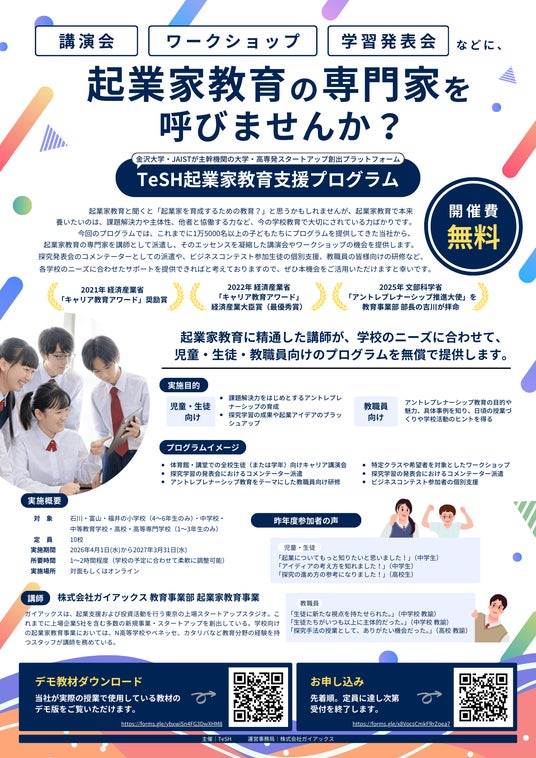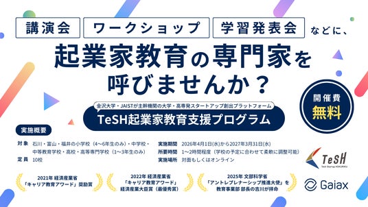 産学官と連携したアントレプレナーシップ教育プログラムを展開する株式会社ガイアックス(本社:東京都千代田区、代表執行役社長:上田祐司、証券コード:3775、以下 ガイアックス)は、北陸地域(石川・富山・福井)の大学・高専が連携するスタートアップ創出プラットフォーム「Tech Startup HOKURIKU(TeSH)」共同機関の取り組みとして、小学校・中学校・高校を対象に、起業家教育の講師を無償で派遣するプログラム「TeSH 起業家教育支援プログラム」を実施します。