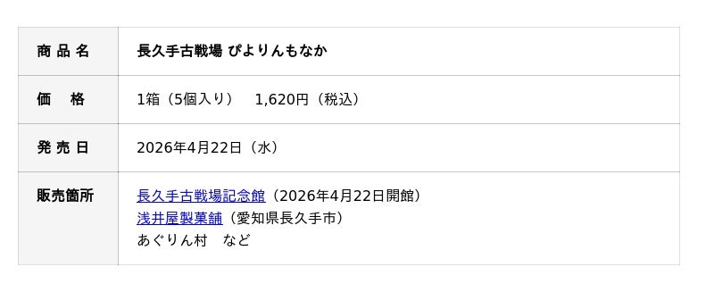 2026年4月22日(水)から、長久手古戦場記念館、浅井屋製菓舗で発売