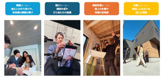 本動画では、当社従業員が出演し、営業担当者を中心に各現場の担当者と連携しながら、お客様に寄り添って家づくりを進める様子を、商談から引き渡しまでの流れとして紹介しています。