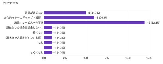 文化的マナーのギャップや言語の壁も一定数見られ、オーバーツーリズムが単なる混雑問題にとどまらず、サービス品質や顧客体験にも影響を及ぼしていることがわかります。