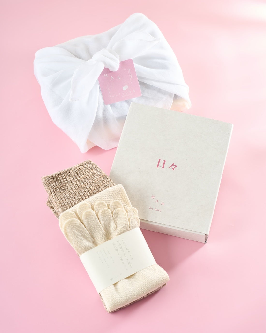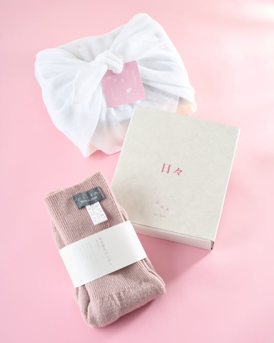 HAAの入浴剤「HAA for bath 日々 (5個) ギフトボックス ささやかな愛」と、くらしきぬの「お手軽冷えとり靴下 重ね履き2足セット」を組み合わせました。