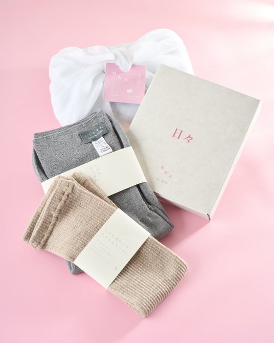 HAAの心温まるエッセイ付きの入浴剤「HAA for bath 日々 (5個) ギフトボックス ささやかな愛」と、くらしきぬの看板商品「シルク&ウールはらぱん ショートタイプ」を特別に染め上げた「蘇芳染めはらぱん ショートタイプ」を組み合わせました。