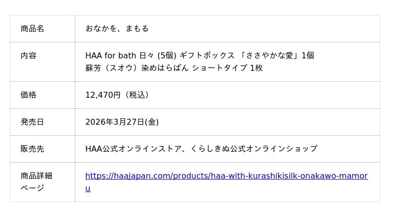 HAAの公式オンラインストア、くらしきぬの公式オンラインショップが、共通で販売するギフトセットとして、「おなかを、まもる」「てを、いたわる」の2種ご用意しています。ギフトセット1. おなかを、まもる