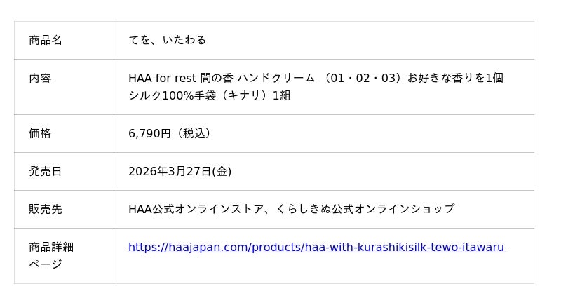 HAAの「HAA for rest 間の香(まのか)ハンドクリーム」と、くらしきぬの「シルク100%手袋」をセットにしました。