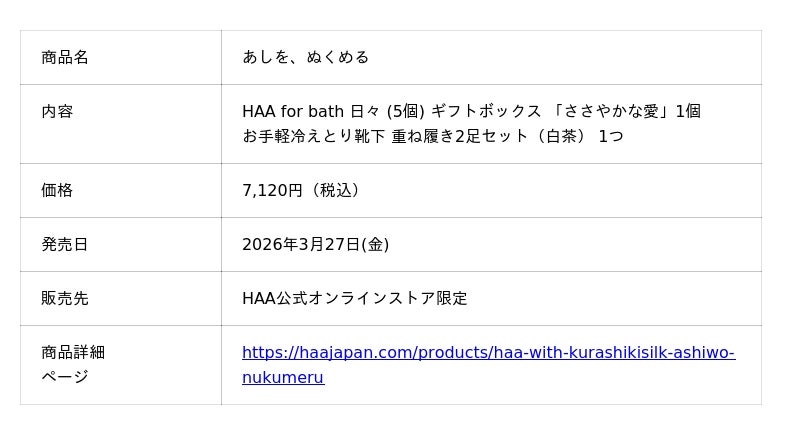 別府・鉄輪(かんなわ)温泉発のライフスタイルブランド株式会社HAA(本社:大分県別府市、代表:池田佳乃子)は、冷えとり靴下と絹の肌着のブランド「くらしきぬ」(運営:株式会社クラビズ、本社:岡山県倉敷市)と初のコラボレーションを実施いたします。