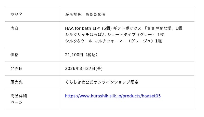 HAAの入浴剤「HAA for bath 日々 (5個) ギフトボックス ささやかな愛」と、くらしきぬの上質なシルクを94%使用した「シルクリッチはらぱん」、冷房対策として活躍する「マルチウォーマー」をセットにしました。