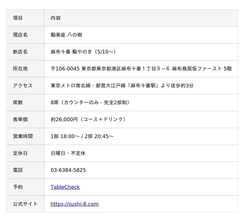 東京・麻布十番に2023年5月にオープンした鮨カウンター「鮨楽座 八の樹」(運営:株式会社DELIX/株式会社グレイドグループ)は、2026年5月10日に「麻布十番 鮨やのき」へと店名を変更し、リニューアルオープンを予定しています。わずか8席の同店は、開業から3年間、独自の熟成技法と厳選食材へのこだわりを積み重ねてきました。その結果、リピーター率4割・紹介率4割を記録。口コミとリピートで支えられる店へと成長した今、「現店舗ラストシーズン」を迎えるにあたり、3年間で到達した味づくりの裏側をお伝えします。■ 背景:麻布十番の寿司激戦区で、"名もなき店"が3年で変わるまで