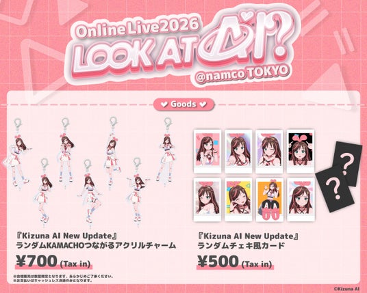 本公演「LOOK AT AI?」は、バーチャルYouTuberの先駆者であるKizuna AIが、新曲『KAMACHO』のリリースに伴い、新たな一面を披露する完全無料の3DCGオンラインライブです。YouTubeチャンネル「Kizuna AI - A.I.Channel」で完全無料で配信され、且つ東急歌舞伎町タワー内のアミューズメント施設「namco TOKYO」にて、大画面と迫力の音響でライブを体感できるパブリックビューイングの実施が決定いたしました。会場では、Kizuna AI New Update Goodsとして販売した「つながるアクリムチャーム」「ランダムチェキ風カード」を数量限定で最速販売を予定しています。